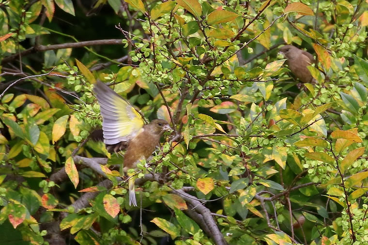 褐色の鳥に見えますが、飛翔時の翼の黄色帯は鮮やかでよく目立ちます。