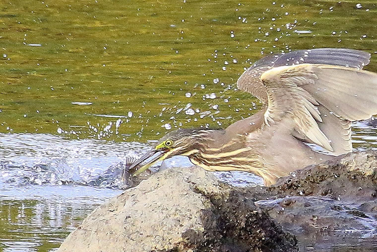 近くに来た魚に反応して、水面に突き出したクチバシが魚に突き刺さりました!