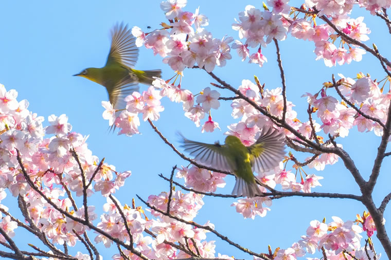早咲きの“玉縄桜”の蜜を求めてメジロが飛び交ってました。