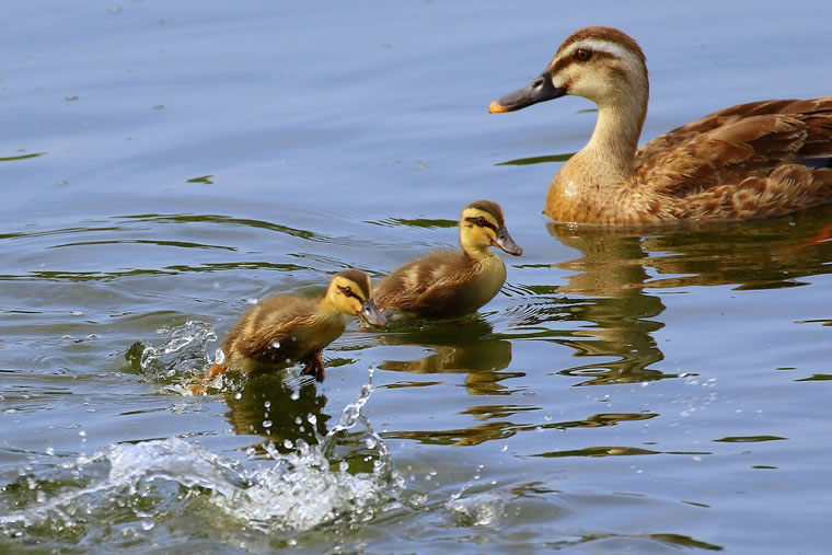 写真の左下で魚が跳びはねたので、カルガモ幼鳥さんは、驚いて飛びあがった瞬間です。