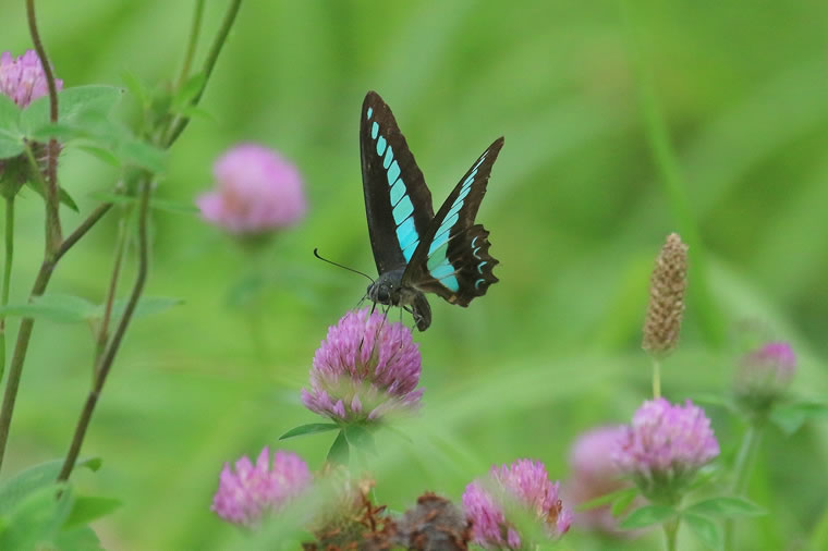 ムラサキツメクサとアオスジアゲハの色のコントラストが綺麗でした。