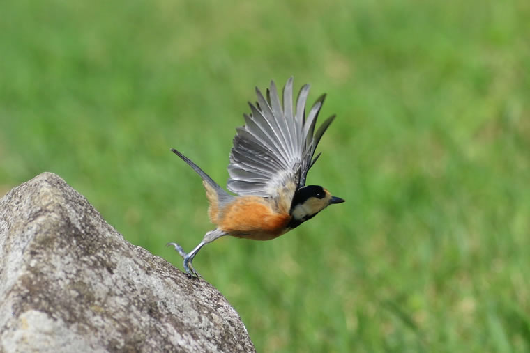 ヤマガラの脚が石から離れる直前の、飛び出す瞬間です。