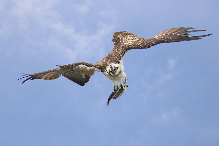 水中に飛び込み、水面から飛び出すと、なんと両足に獲物を掴んでいました。