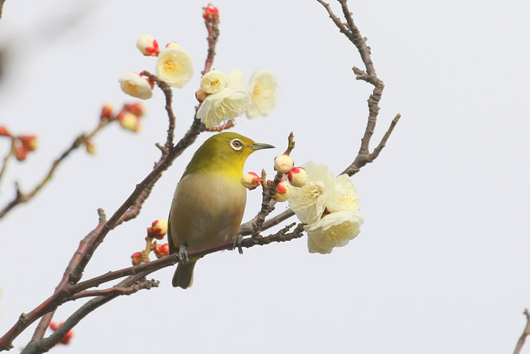 一年中見かけるメジロですが、梅が一番似合うように思えます。
