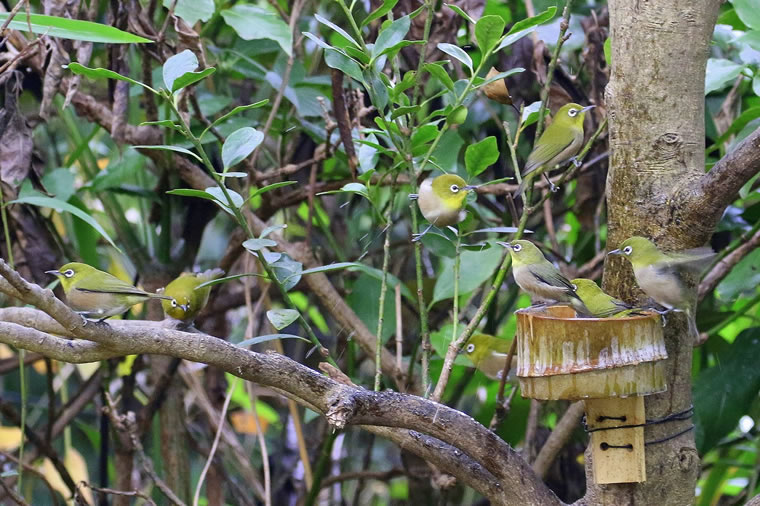 その水飲み場にメジロの群れがやってきて、入れ代わり立ち代わりで、水浴びしてました。
