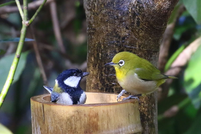 メジロが、水浴びしているシジュウカラに向かって「早く代わってよ!」と言っているようでした。