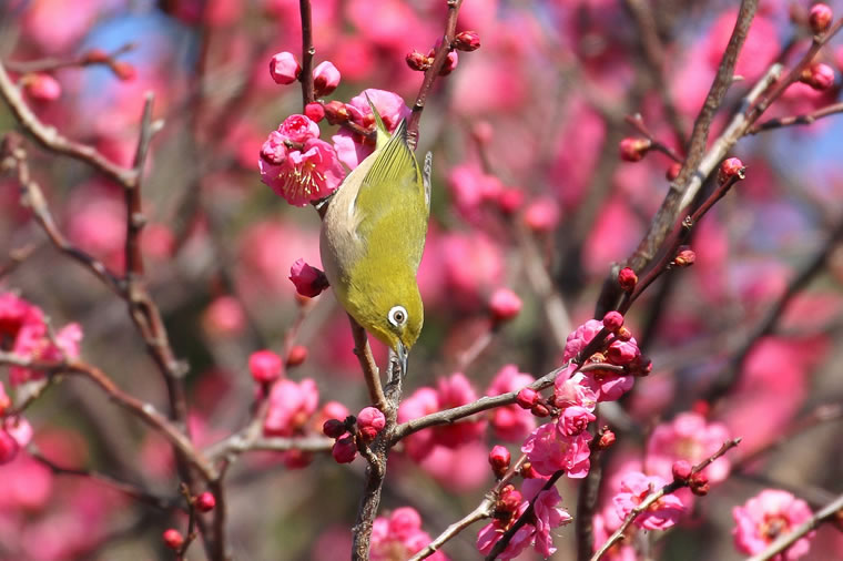 メジロは、紅梅よりも白梅の蜜ほうが好きのようですが、白梅が咲く前は、紅梅にやってきて、1年ぶりの梅の蜜を味わいます。