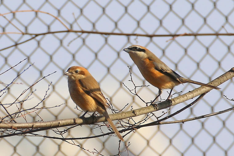 近くのサッカー場の裏にいくと、モズが盛んに鳴いているのが聞こえてきたので、声のする方に近づいていくと、モズのカップルに出会いました。