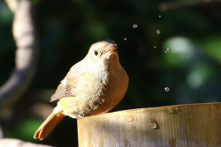 水を飲んだ後、顔を勢いよく上げると、水滴が飛びあがっていました。
