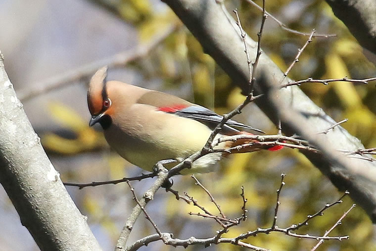尾の先が緋色(ヒイロ)のヒレンジャクが高い枝の上から、下の様子をうかがっています。
