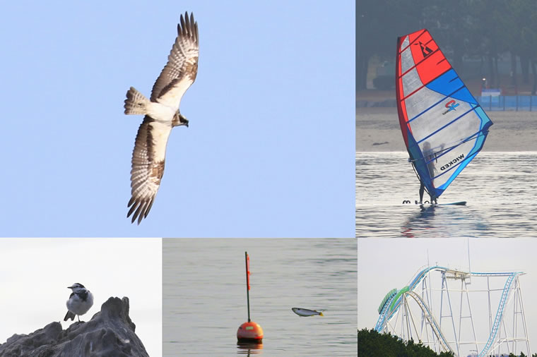 海上ではブイの近くでボラが跳びはね、ウィンドサーフィン、岩場の上にはハクセキレイ、八景島のジットコースタが目に入りました。