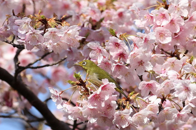 2月下旬に早咲きの玉縄桜(タマナワザクラ)が、咲き始め、早速メジロが蜜を吸いにやってきました。