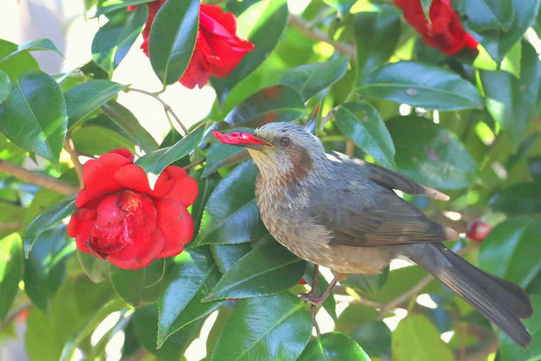 ツバキの赤い花びらをヒヨドリがおいしそうに啄んでいます。
