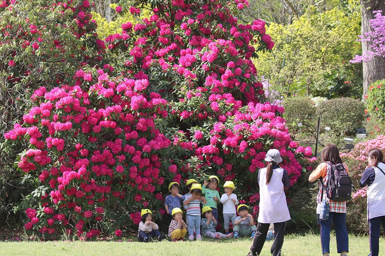 大きな、シャクナゲの木の前で、保育士さんのカメラの前で、さまざまなポーズをとっている園児たちが微笑ましかったです。