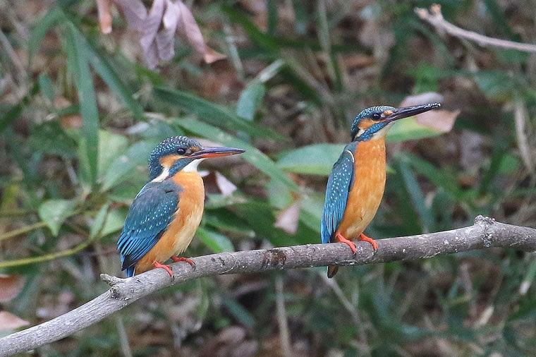 この雌雄2羽が並んだ写真では、クチバシの色の違いがよくわかります。下クチバシが赤いのがメス(左)、上下クチバシとも黒いのがオス(右)です。