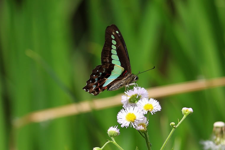 カワセミたちが去ったあと、ふと、近くを見ると、ハルジオンの花に、アオスジアゲハが止まっていました。