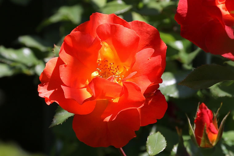 美しい朱色の、優しい平咲き。大きな房になって咲き、樹は直立気味に高く伸びます。