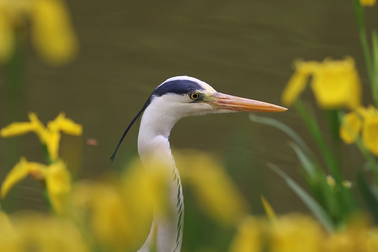 普段は地味なアオサギも、黄菖蒲と一緒に撮ると、優雅見えます。