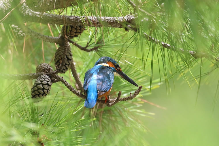 珍しく、松の木に止まり、下の魚を狙っていました。