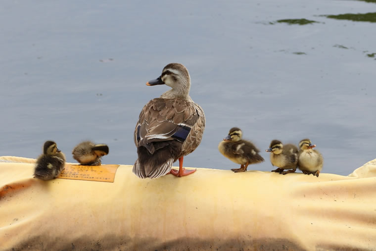 自宅の目の前にある“ふなだまり公園”に人だかりができていたので、何事かと見に行ったら、 カルガモ親子でした。