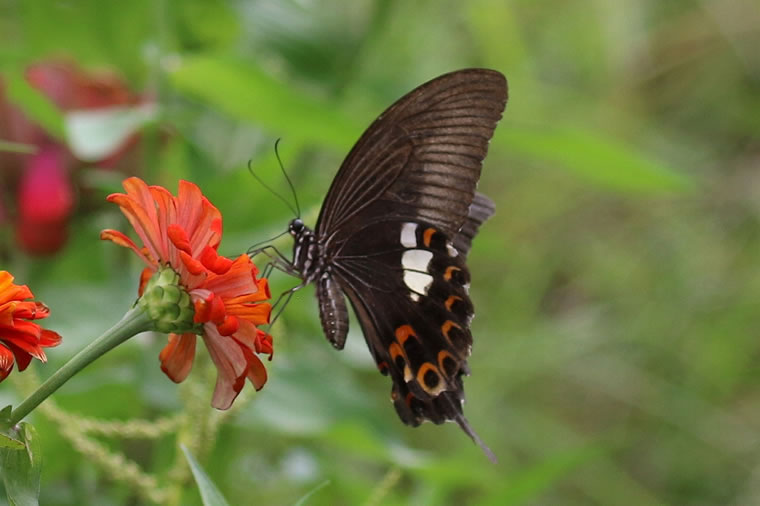 ヒャクニチソウ(ジニア)とアゲハチョウの羽の色のコントラストに惹かれました!