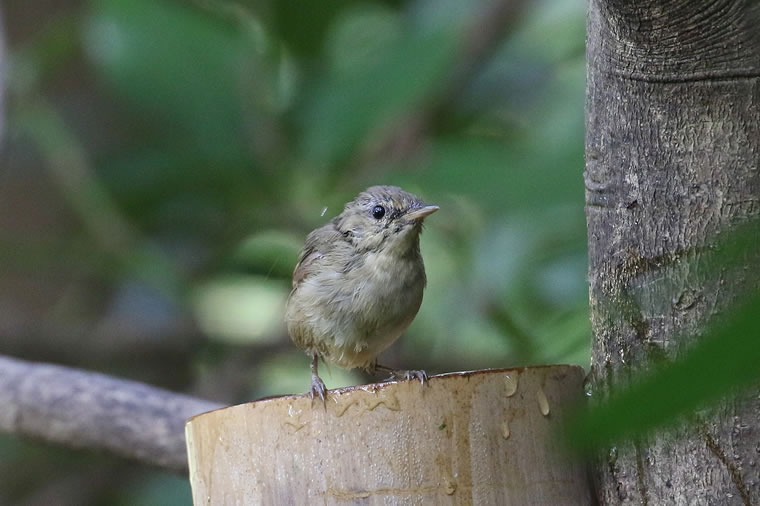 残暑厳しい日に、竹筒で作った水飲み場に水を入れた直後に、ウグイスが水浴びにきました。