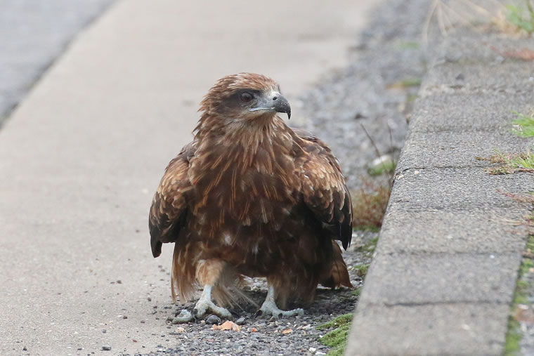 上空ではよく見かけるトビですが、地面に降りているのを近くで見ると、その目の鋭さはさすがに猛禽類です。