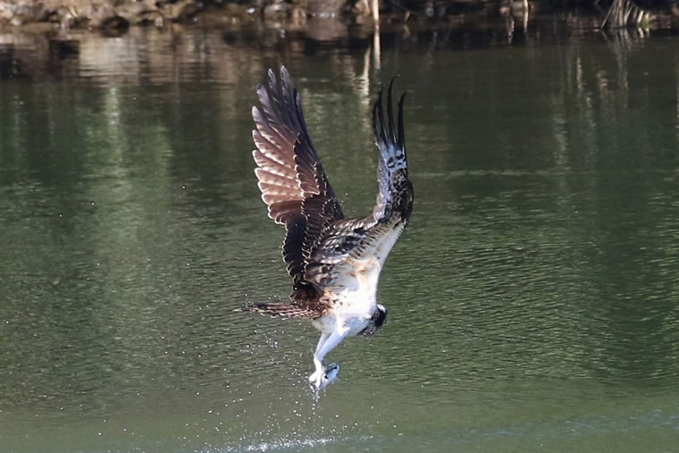 まだ若いミサゴのようで、6分間に5回、水中に飛び込みましたが最初の4回は失敗。5回目にしてようやく小さな魚をゲット!