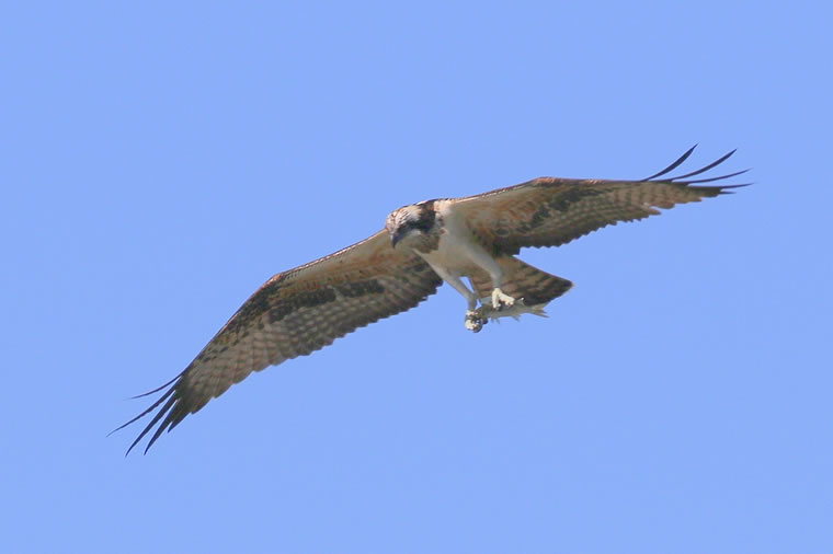 ミサゴはトビと似ていますが、羽の下側とお腹が白いので、慣れると見分けやすいです。