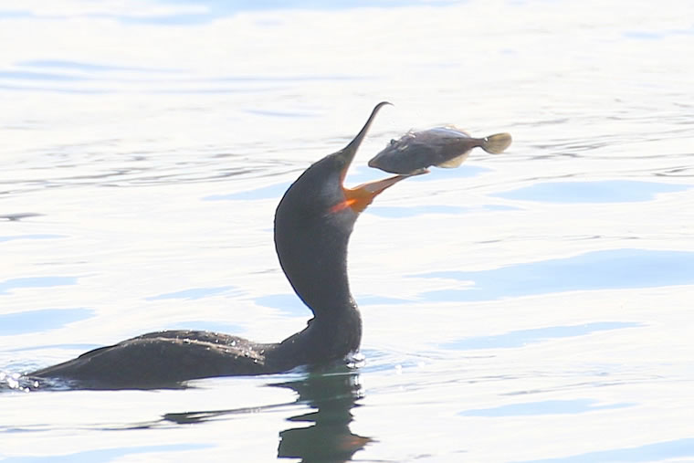 大きすぎて、なかなか呑み込めず、トビが横取りしようと、盛んに上空から急降下していましたが、そのたびに水中に潜り込んでかわし、何とか呑み込みました。