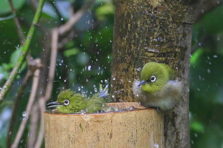 竹筒で作った水飲み場に、水を入れてあげたら、すぐにメジロたちが現れ、気持ちよさそうに水浴びをしていました。