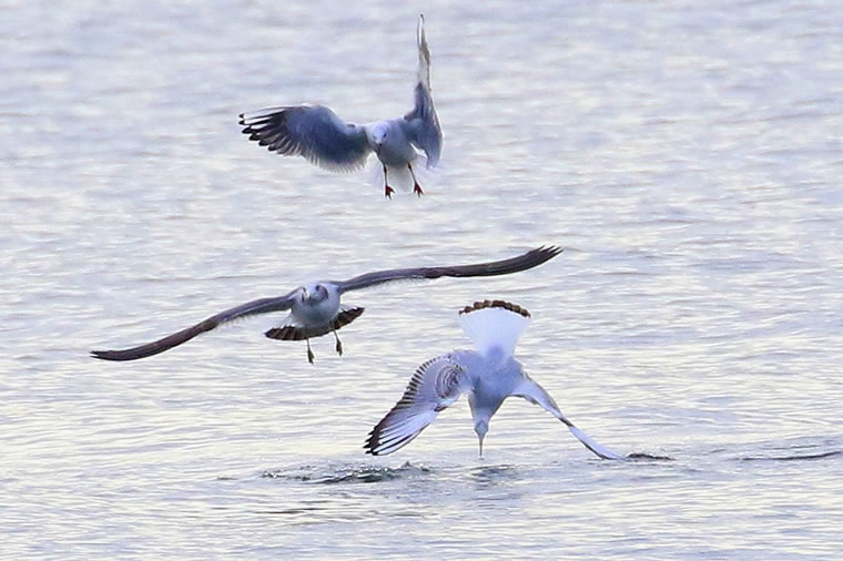 空中高く飛び回っていたユリカモメたちが、次々に海面に降りてきました。