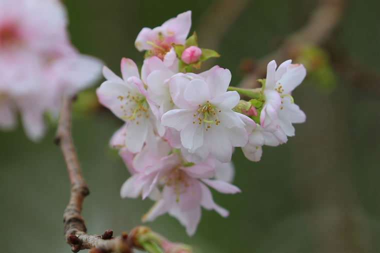 ソメイヨシノの葉が黄色と赤色に色づいてきましたが、その近くで冬桜(別名、十月桜)が薄ピンク色の花を咲かせていました。