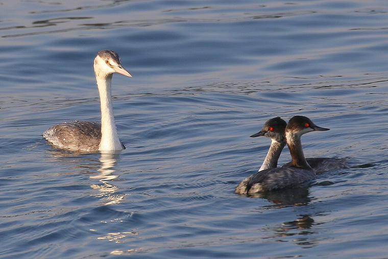右側の眼の赤い鳥2羽がハジロカイツブリ。