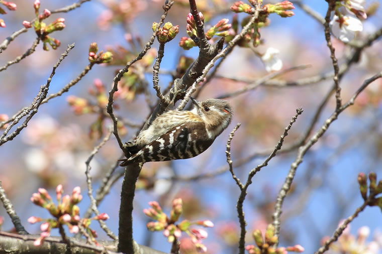 蕾が膨らみ始めたソメイヨシノの枝に、珍しくコゲラが止まりました。