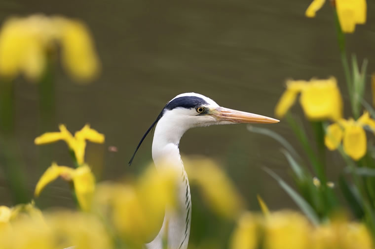 黄菖蒲 (きしょうぶ)があたり一面咲いているところに、アオサギが姿を見せてくれました。