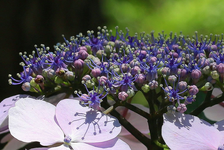 ガクアジサイの中心部の花序を拡大すると、別の世界が見えてきます。