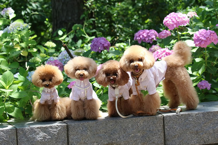 アジサイを撮っていたら、可愛く着飾ったワンちゃんたちに、「こっち見て! 動かないで!」と声をかけながらご主人(女性)が写真を撮っていました。