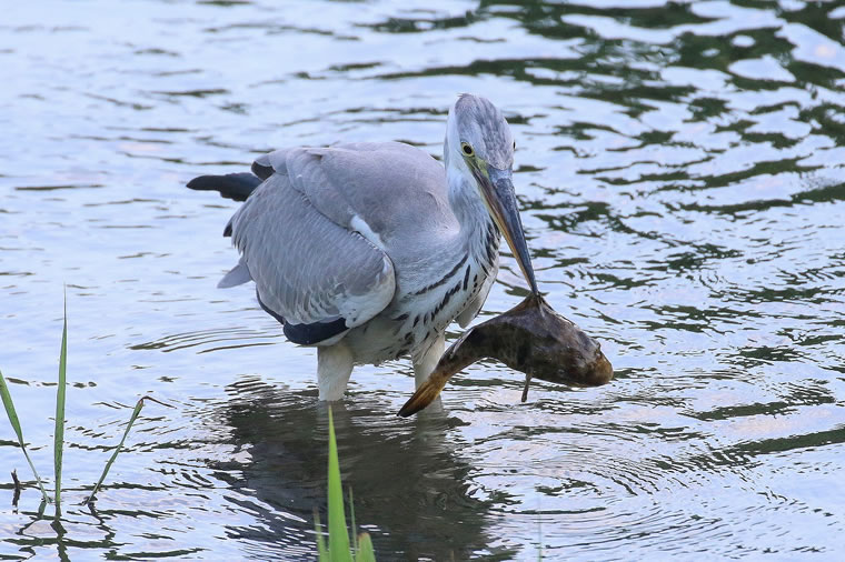 水面にクチバシを突っ込んだと思ったら、大きなナマズらしきものを捕らえました。
