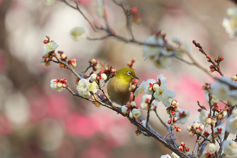白梅に止まったメジロさんの背景のピンクは紅梅です。