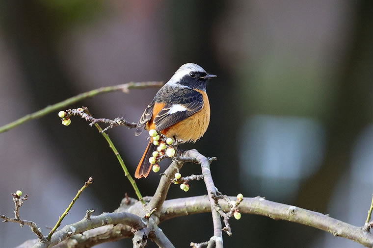 蕾がまだ小さい枝垂れ梅(白梅)の枝に止まってくれました。