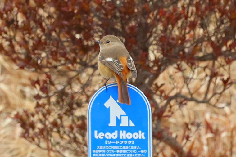 公園の片隅のトイレの近くにあった、犬のリードを繋ぐリード・フックに止まりました。