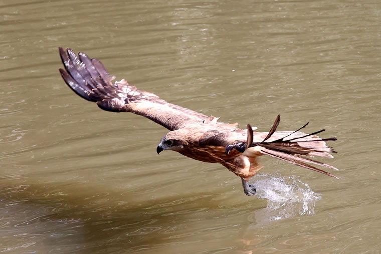 子供が食パンをちぎってオナカガモに与えているのを、トビが上空高いところから見ていましたが、大き目のパンが投げられたとたん、あっという間に急降下してきて、パンを持ち去りました。