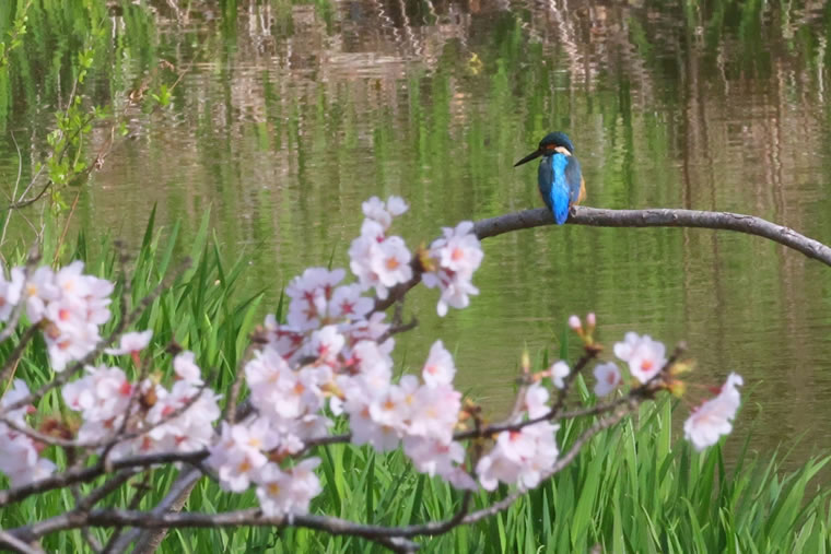 止まり木にカワセミが止まったので、移動して手前に桜の花がくるポイントで撮りました。