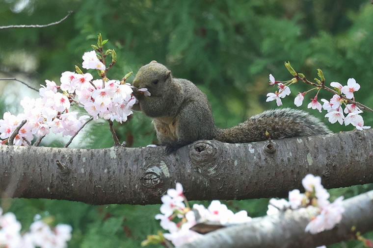 桜の枝が大きく揺れたので、しばらく見ているとタイワンリスが現れ、なんと桜の花を食べだしました。