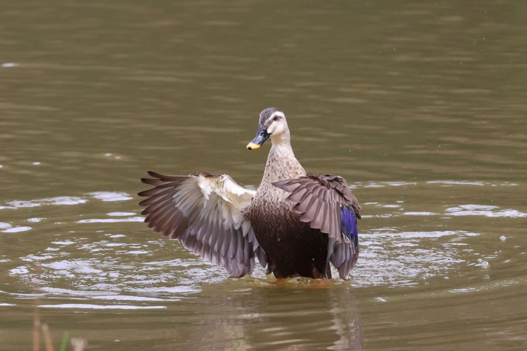 水面で羽ばたき、翼を広げたので、青に輝く風切り羽が見えました。