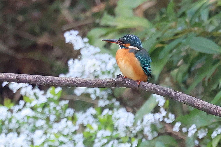 白いユキヤナギの花を背景にすると、カワセミの色が映えます。
