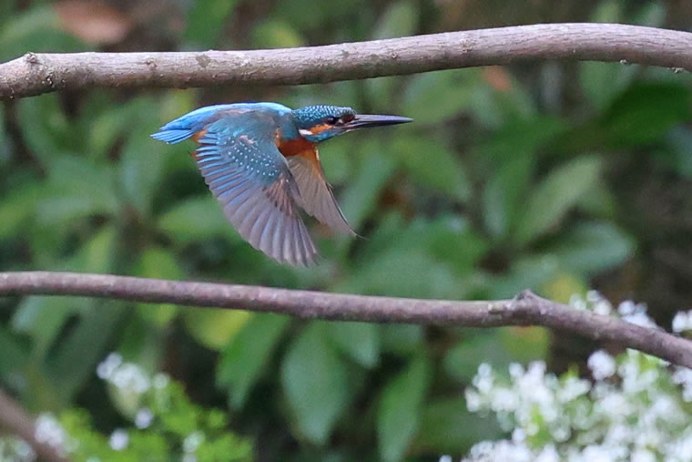 ユキヤナギの白い花を背景に、飛んでいるカワセミは優雅に見えます。