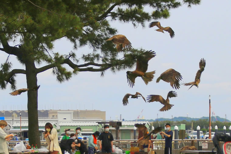 トビは多いときは上空で30羽ほどいて、隙があると急降下してきます。