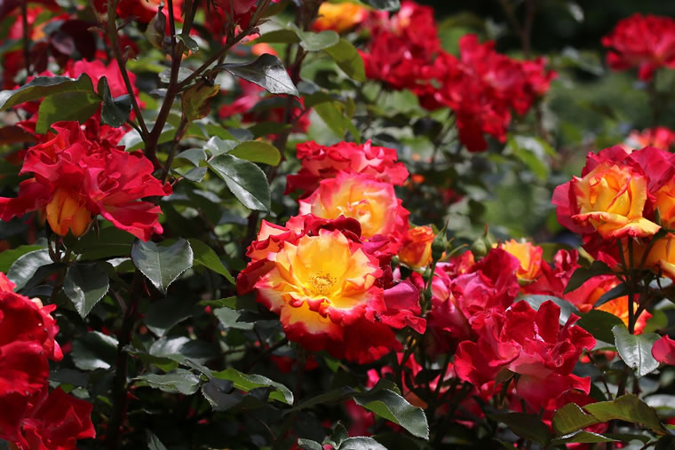 7cmほどの大きさの半八重咲きで、咲き始めは花びらの全体が黄色で、縁が赤い程度ですが、咲き進むにつれ赤みが増します。